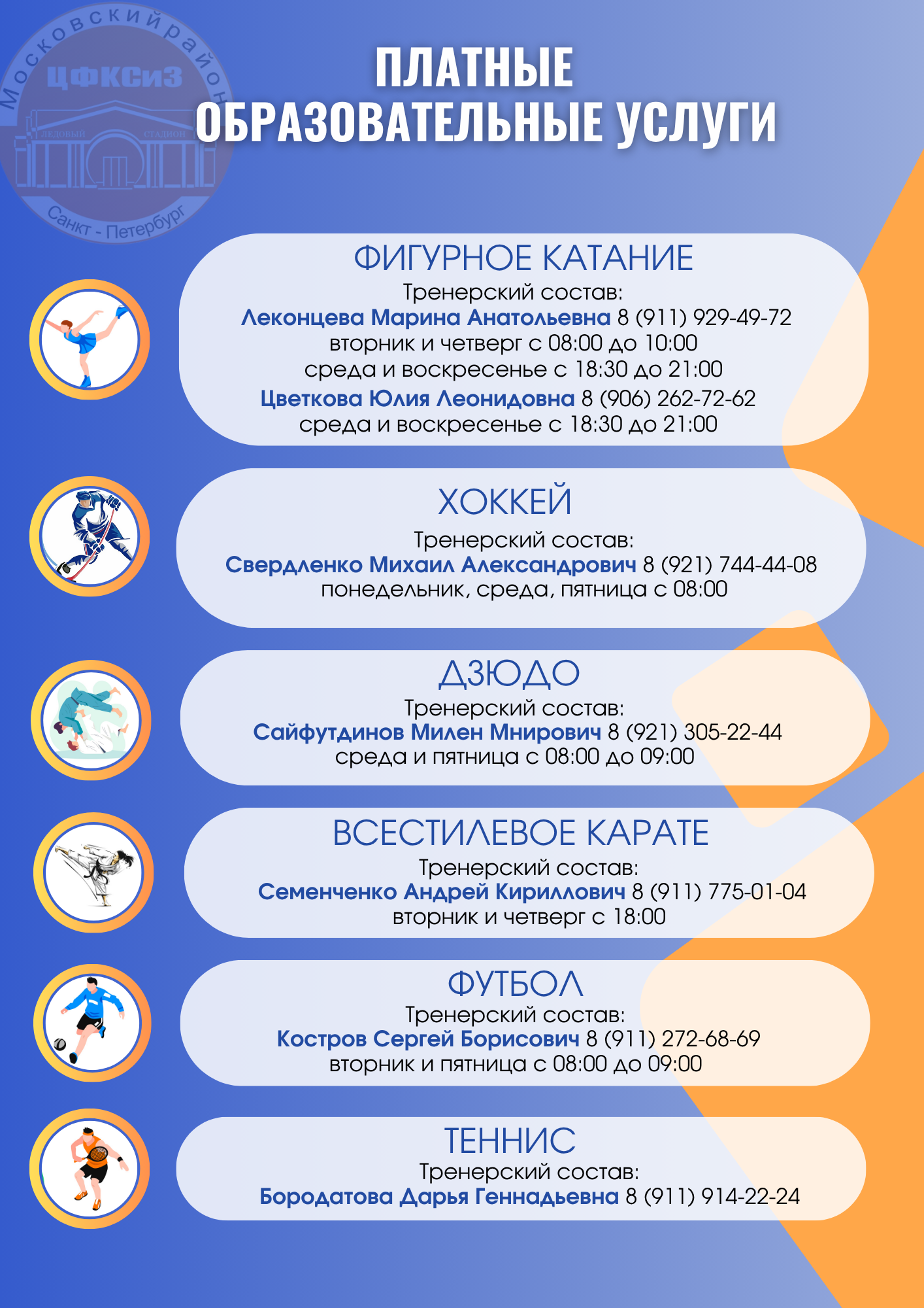 Занятия проводят опытные педагоги, тренеры высшей квалификации, мастера спорта, участники и призеры международных соревнований.